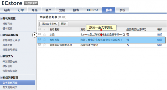 2、 进入ecstore后台,在微信管理中添加一条文字消息