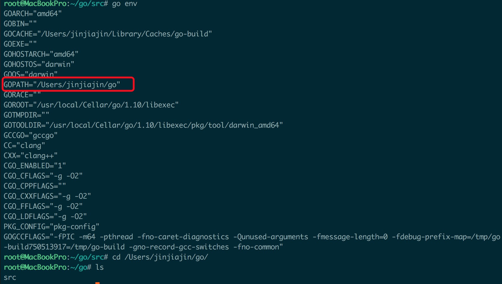 目录为:GOPATH="/Users/jinjiajin/go"