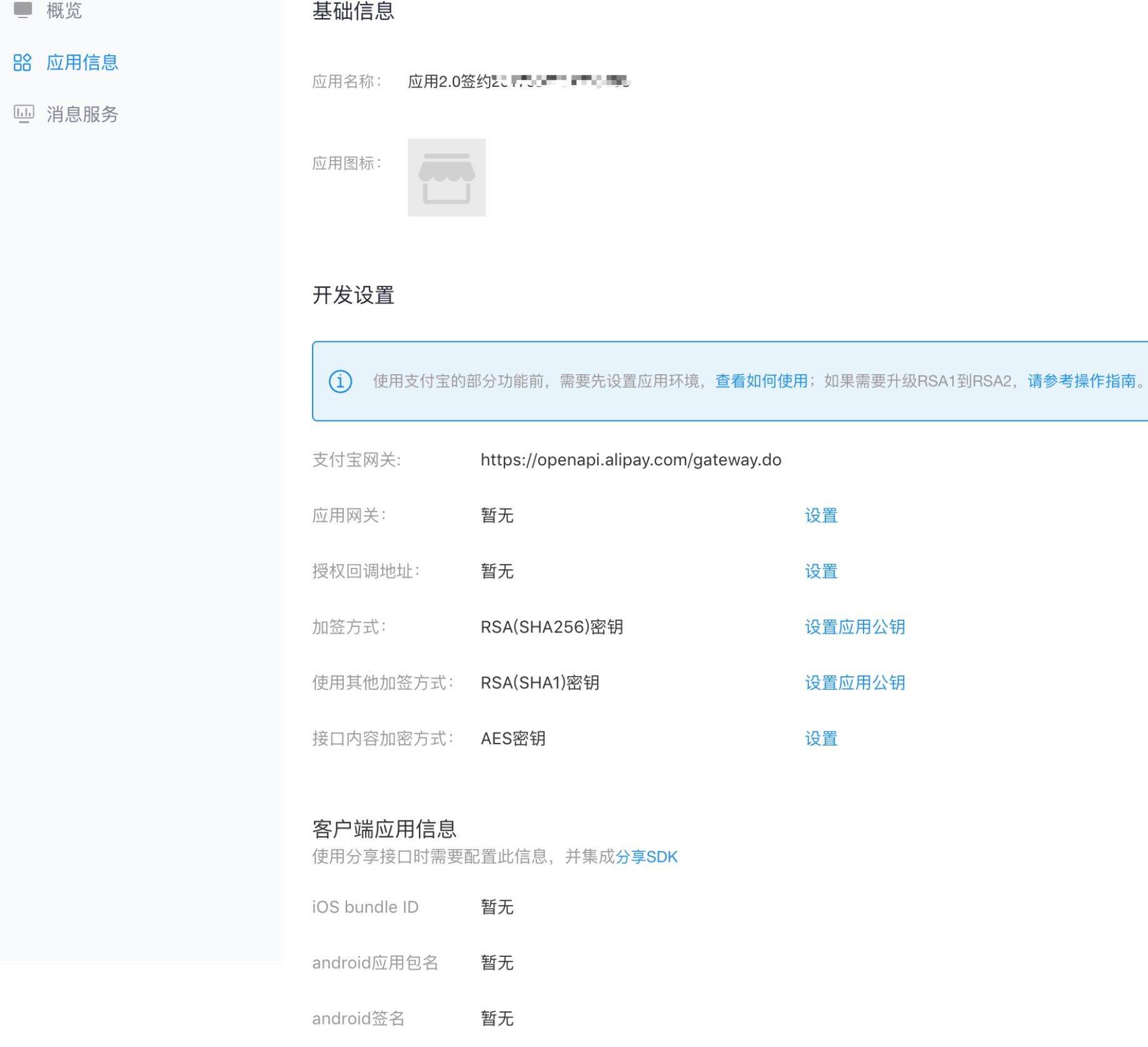 开发者调用接口前需要先生成RSA密钥,RSA密钥包含应用私钥(APP_PRIVATE_KEY)、应用公钥(APP_PUBLIC_KEY)。生成密钥后在开放平台管理中心进行密钥配置,配置完成后可以获取支付宝公钥(ALIPAY_PUBLIC_KEY)。详细步骤请参考《配置应用环境》。
