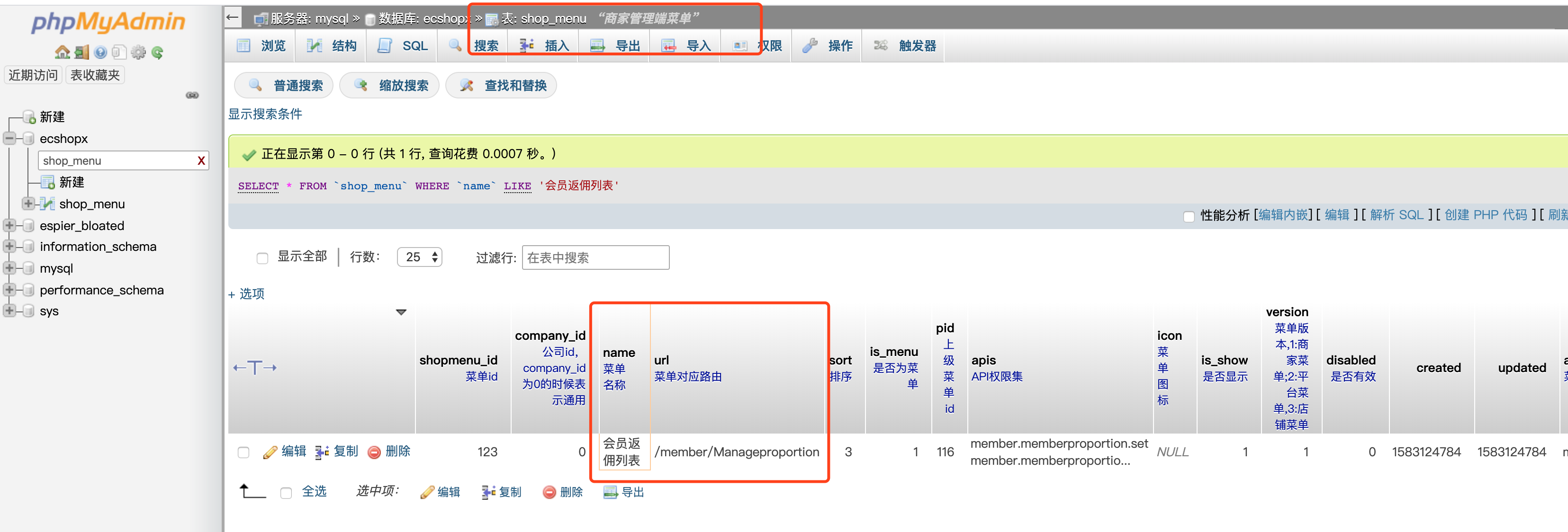 进入数据库查看新增的后台菜单