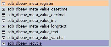 meta_register 用于存储扩展字段的一些信息 meta_value_datetime meta_value_decimal meta_value_int meta_value_longtext meta_value_text meta_value_varchar 用于存放数据,不同的数据类型存放在不同的表中 recycle