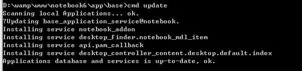 D:\wamp\www\twitter\app\base>cmd update Scanning local Applications... ok. Updating base_application_cache_expires@pam. Installing Cache_Expires DB:PAM_ACCOUNT UPDATE CACHE EXPIRES KV DATA Installing Cache_Expires DB:PAM_AUTH UPDATE CACHE EXPIRES KV DATA Installing Cache_Expires DB:PAM_LOG UPDATE CACHE EXPIRES KV DATA