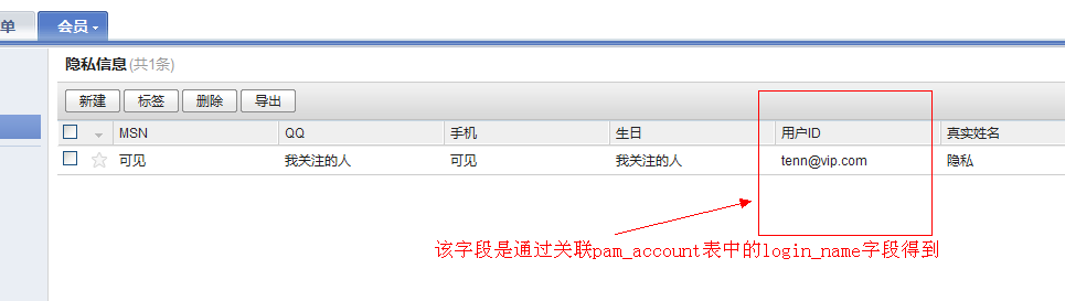 注:如果被链接的表(本例中的pam_accout表)没有字段被设置属性为'is_title'=>true,那么系统默认 将主键的下一个字段为输出数据。