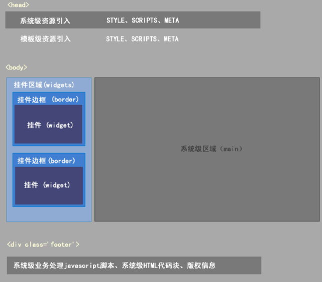 系统级区域用于输出系统的核心交互流程。这些区域的html\javascript是不能在模板包中直接定义的,模板包唯一能影响到这些系统级区域的是 css样式定义,因为模板包的样式表是在系统级样式之后加载。