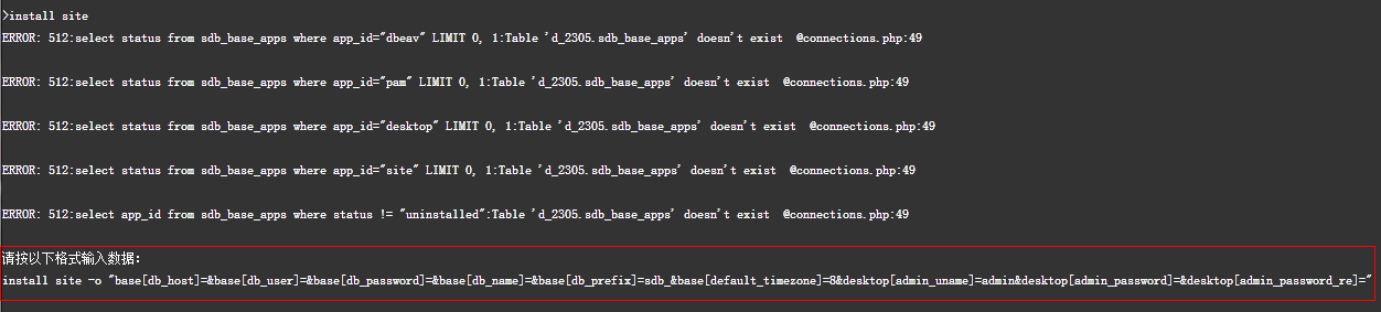base[db_host]= &base[db_user]= DB访问用户名(不用填) &base[db_password]= DB访问密码(不用填) &base[db_name]= 数据库名(不用填) &base[db_prefix]=sdb_ 数据库前缀(默认参数即可) &base[default_timezone]=8 时区(默认参数即可) &desktop[admin_uname]=admin 后台登陆用户名 &desktop[admin_password]=admin 后台登陆密码 &desktop[admin_password_re]=admin 后台登陆密码确认