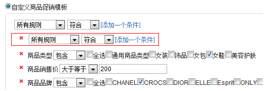 这里的“添加一个条件”,主要包括“条件组合”,“商品属性”,“商品品牌”,“商品类型”,“商品分类”五种条件,“条件组合”,就是再添加一个集合器,即: