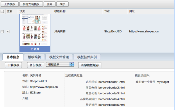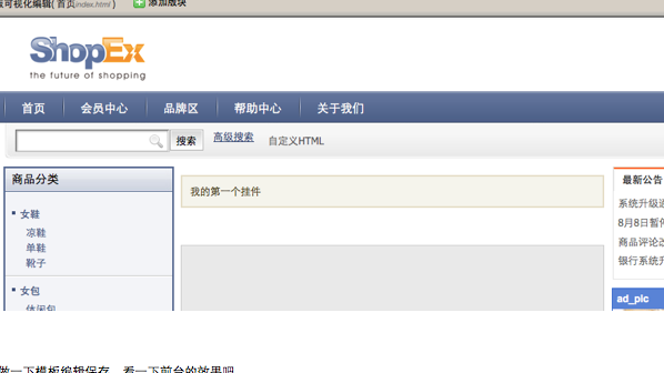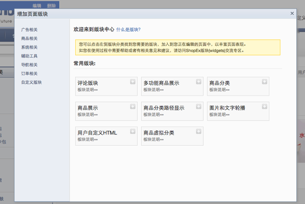 挂件是ShopEx模板机制中的一个重要角色,它能根据条件从后端取得数据然后根据“挂件级页面模板”来包装成一个小板块。