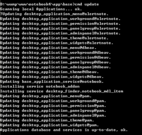 bryant@forsky /Users/bryant/codes/notebook/app/notebook %> sudo ~/codes/notebook/app/base/cmd install -r notebook Creating table sdb_notebook_item Installing service notebook_addon Installing service desktop_finder.notebook_mdl_item Installing Cache_Expires DB:NOTEBOOK_ITEM UPDATE CACHE EXPIRES KV DATA Installing menu notebook_ctl_admin_notebook Installing workground notebook_admin_notebook Installing permission notebook_manage Application notebook installed... ok.