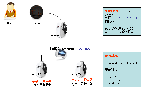 另外两台机器ecos02(ip:10.0.0.2) ecos03(ip:10.0.0.3)为Web服务器, 当中的ecos02为mysql主服务器 ecos03为flare主服务器.